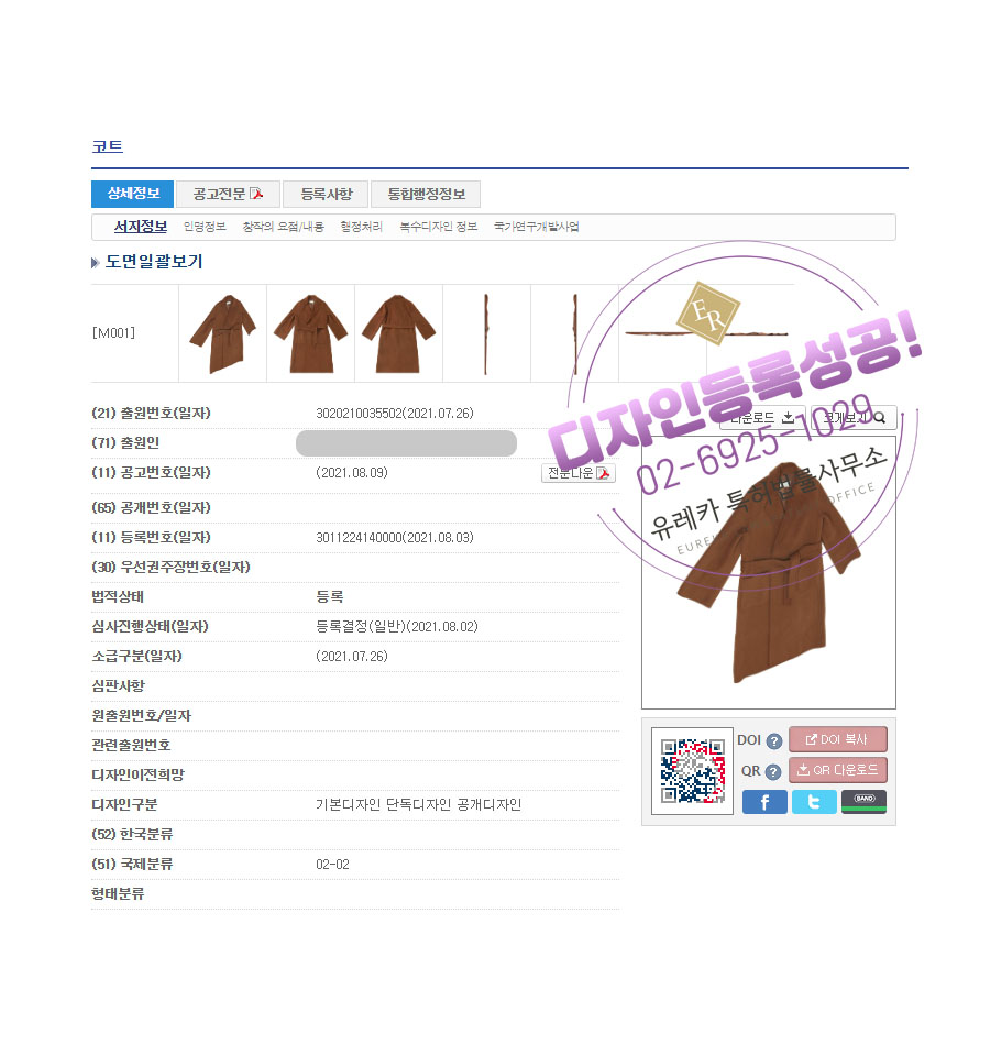 코트에 대한 디자인 출원 의뢰를 유레카에 주셨고