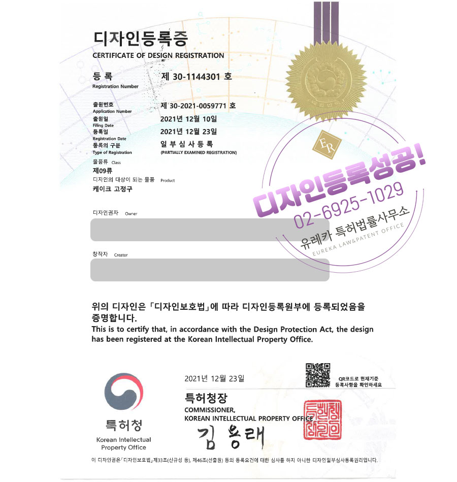 유레카특허법률사무소를 통해 디자인등록이 완료되었습니다.