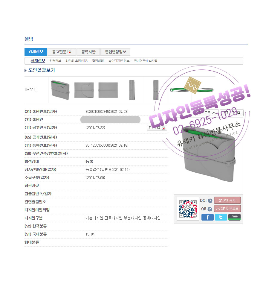유레카특허법률사무소를 통해 디자인등록이 완료되었습니다.