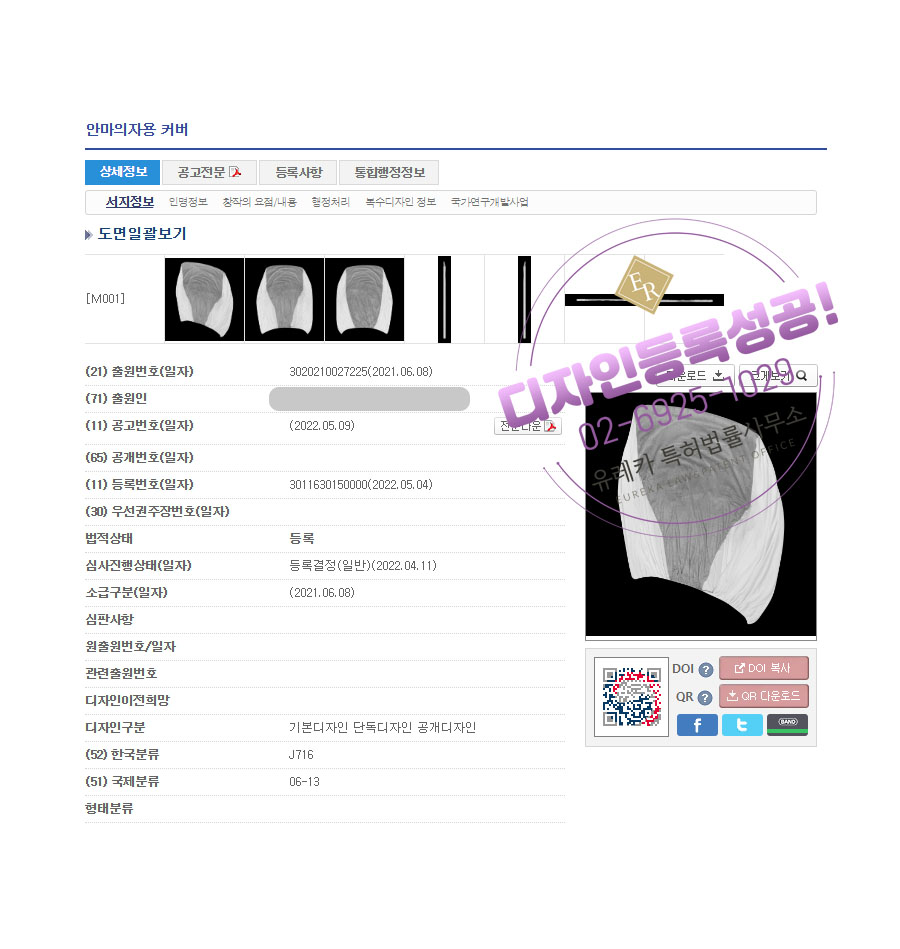 디자인심사를 통과해 최종적으로 안마의자용 커버 디자인등록되었습니다!