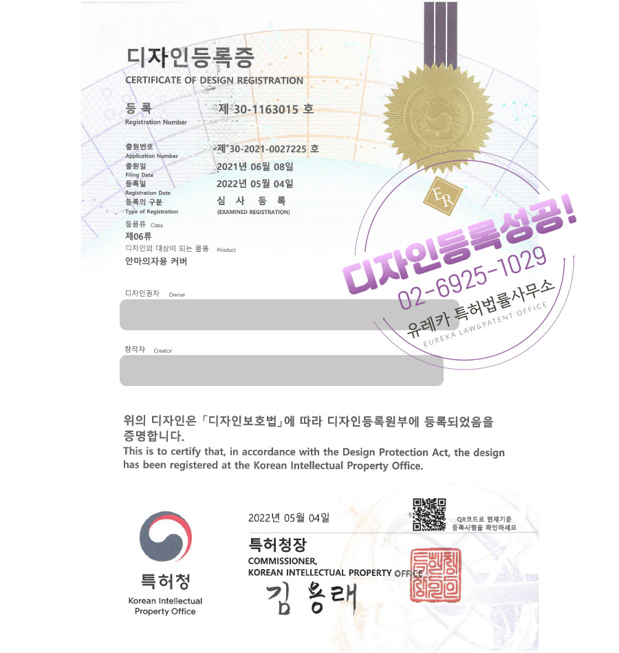 유레카특허법률사무소를 통해 디자인등록이 완료되었습니다.