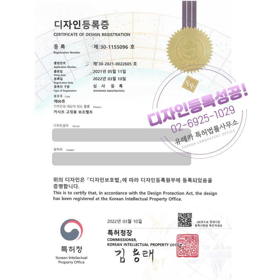 유레카특허법률사무소를 통해 디자인등록이 완료되었습니다.