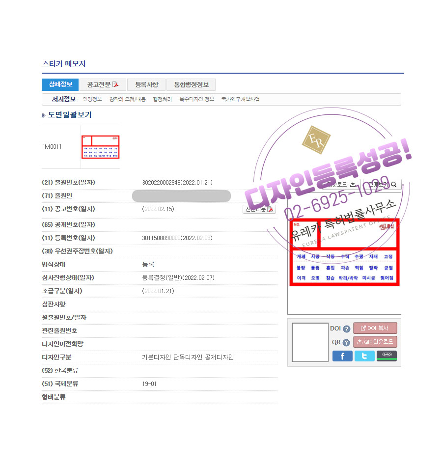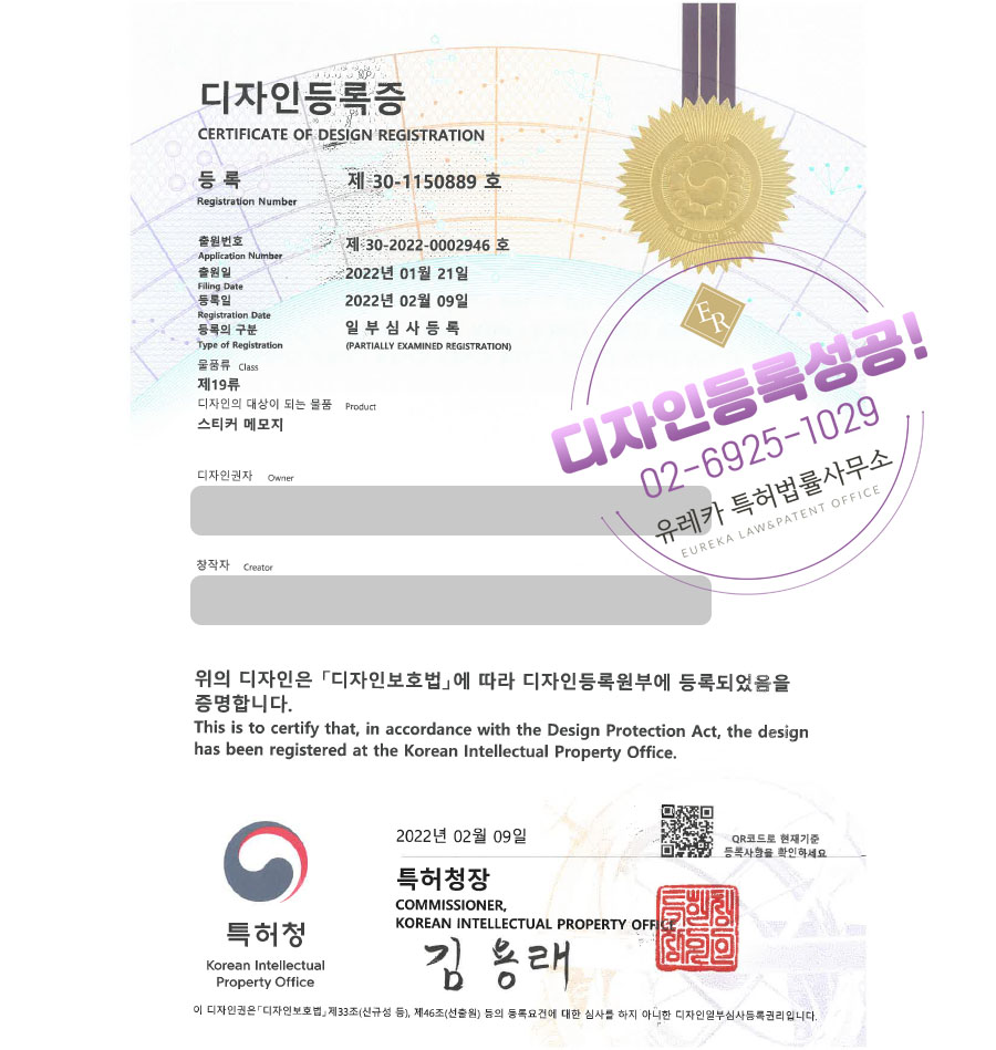 유레카특허법률사무소를 통해 디자인등록이 완료되었습니다.