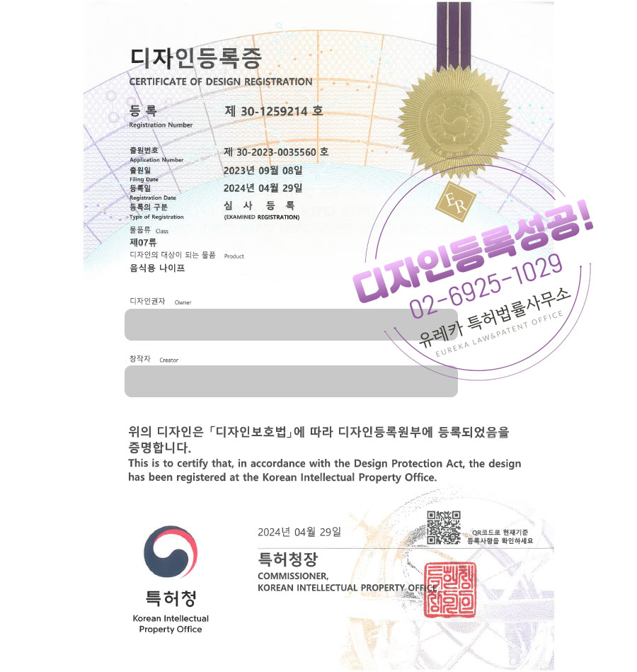 유레카특허법률사무소를 통해 디자인등록이 완료되었습니다.