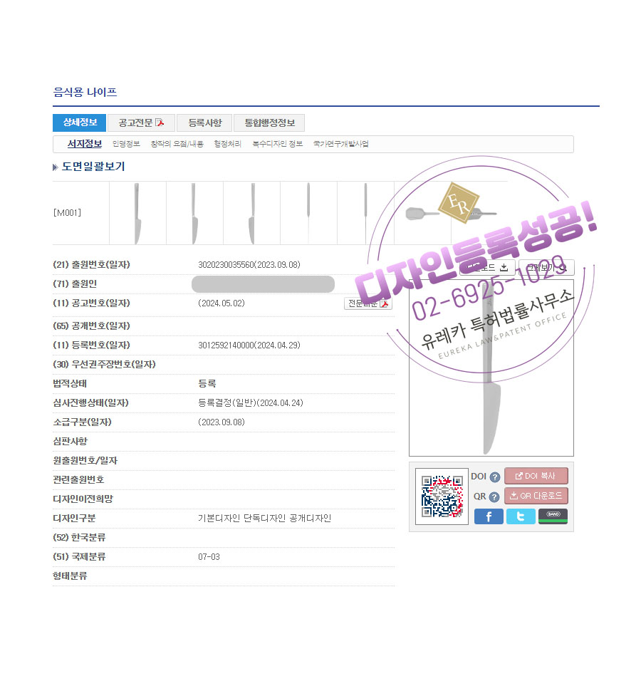 주방 용품, 테이블 나이프, 커트러리 대한 디자인 출원 의뢰를 유레카에 주셨고
