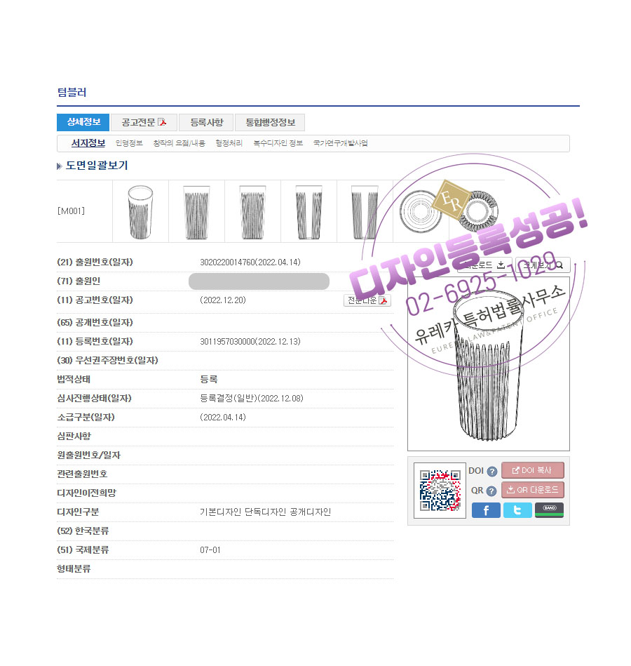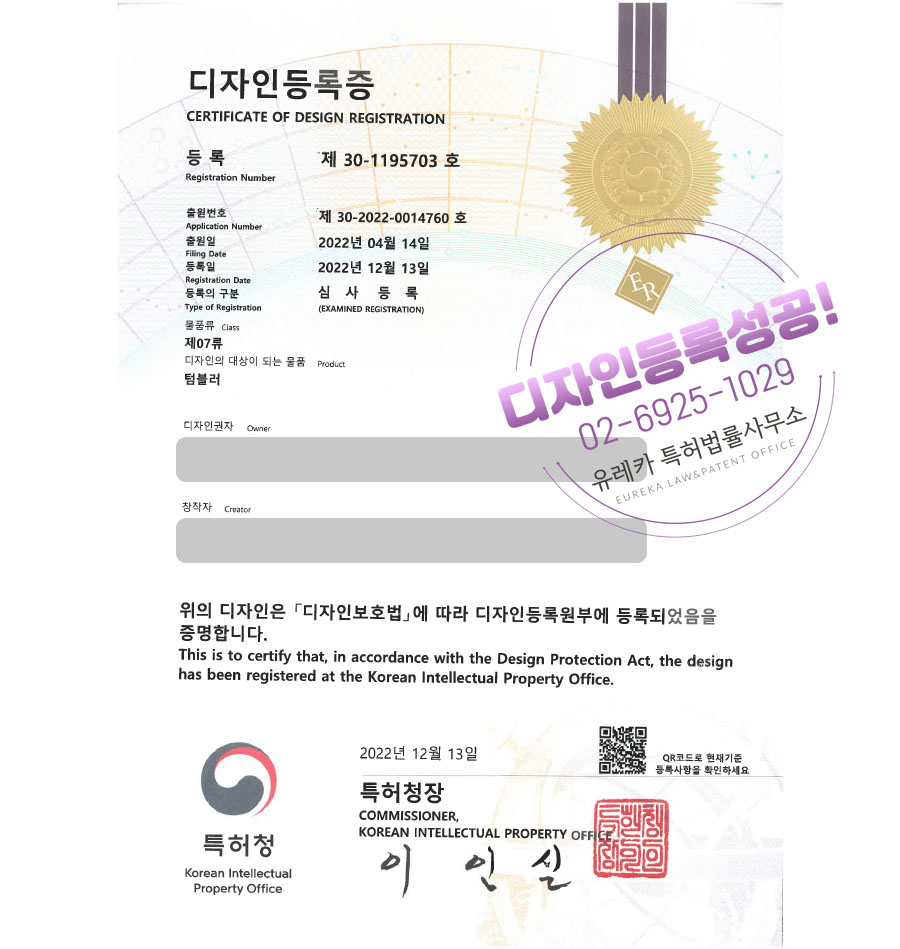 유레카특허법률사무소를 통해 디자인등록이 완료되었습니다.
