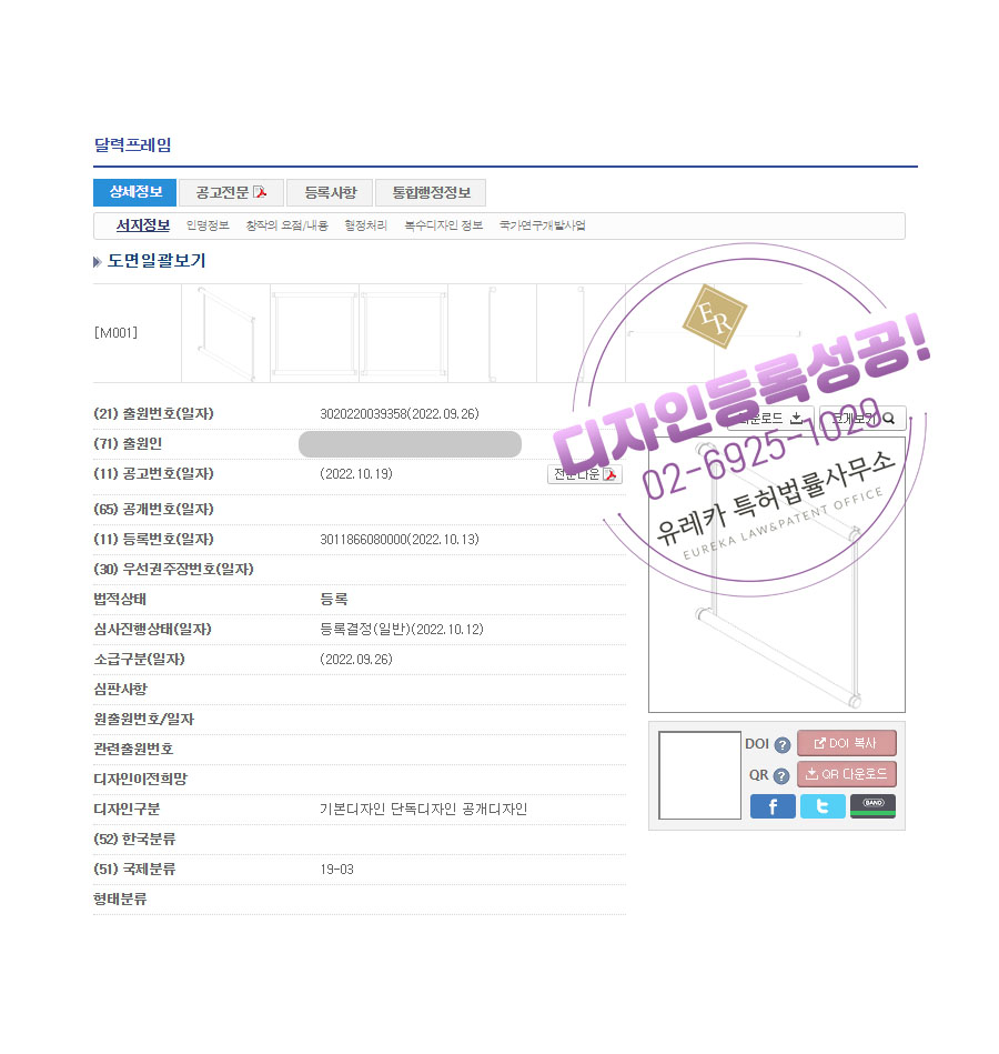 유레카특허법률사무소를 통해 디자인등록이 완료되었습니다.