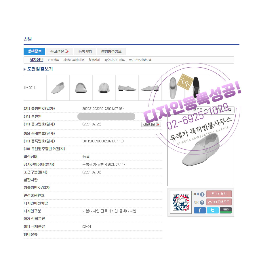 신발에 대한 디자인 출원 의뢰를 유레카에 주셨고
