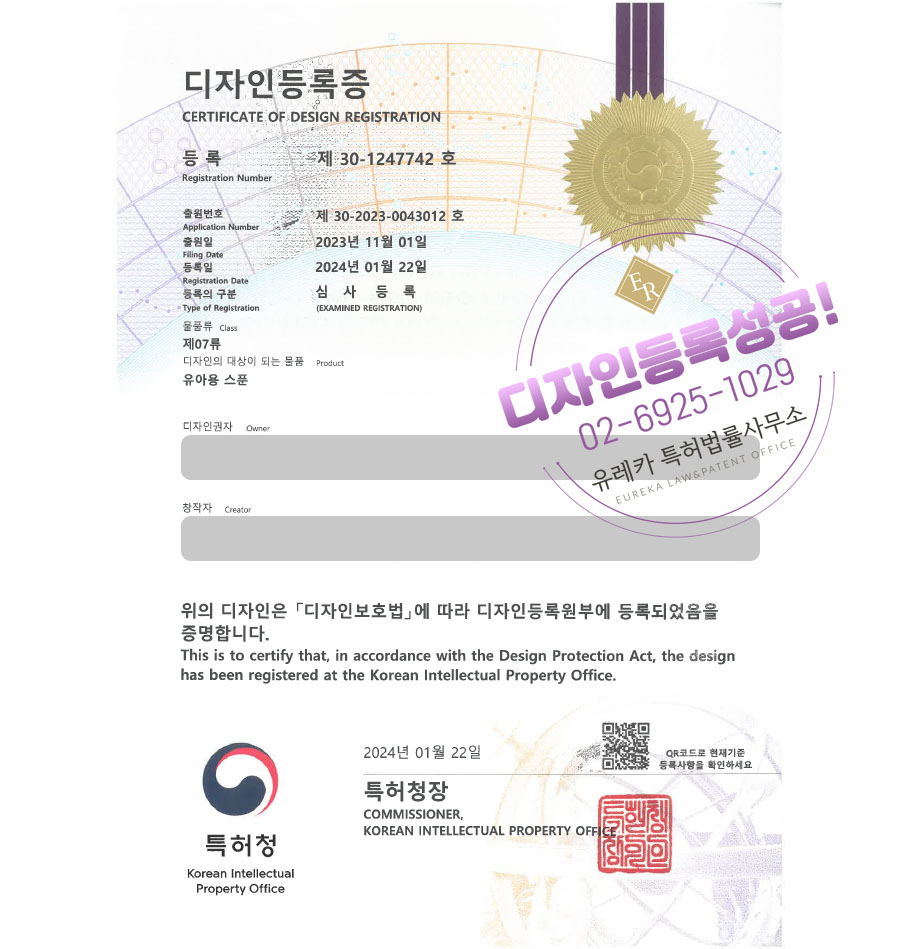 유레카특허법률사무소를 통해 디자인등록이 완료되었습니다.