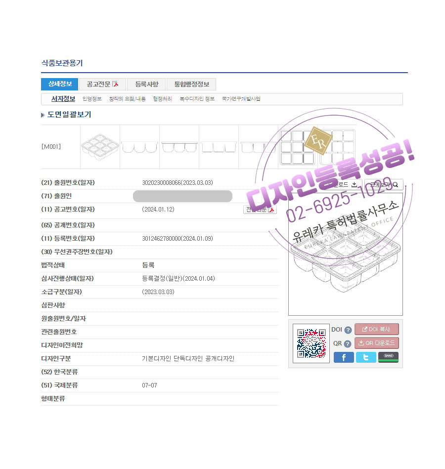 식품보관용기에 대한 디자인 출원 의뢰를 유레카에 주셨고