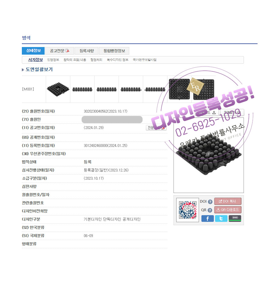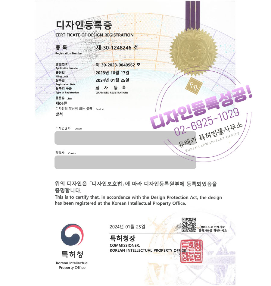 유레카특허법률사무소를 통해 디자인등록이 완료되었습니다.