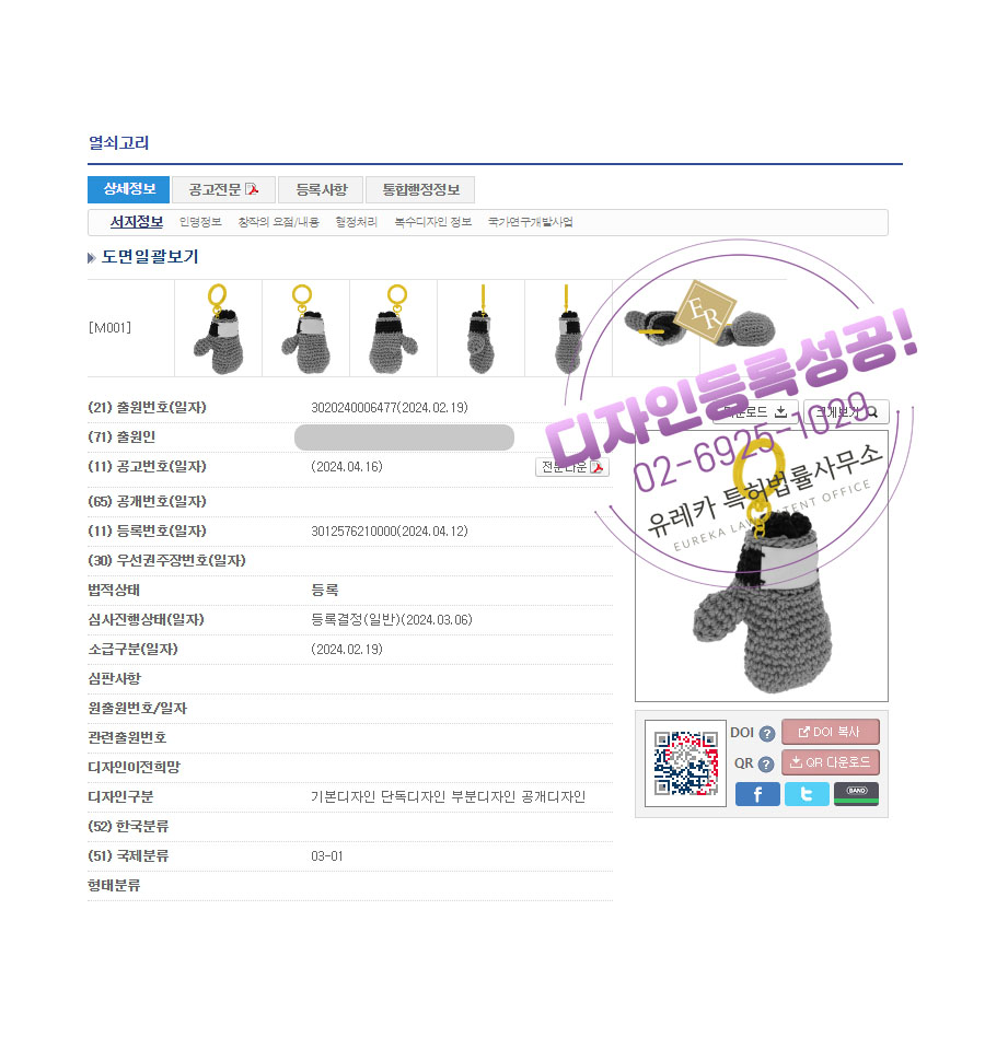 유레카특허법률사무소를 통해 디자인등록이 완료되었습니다.