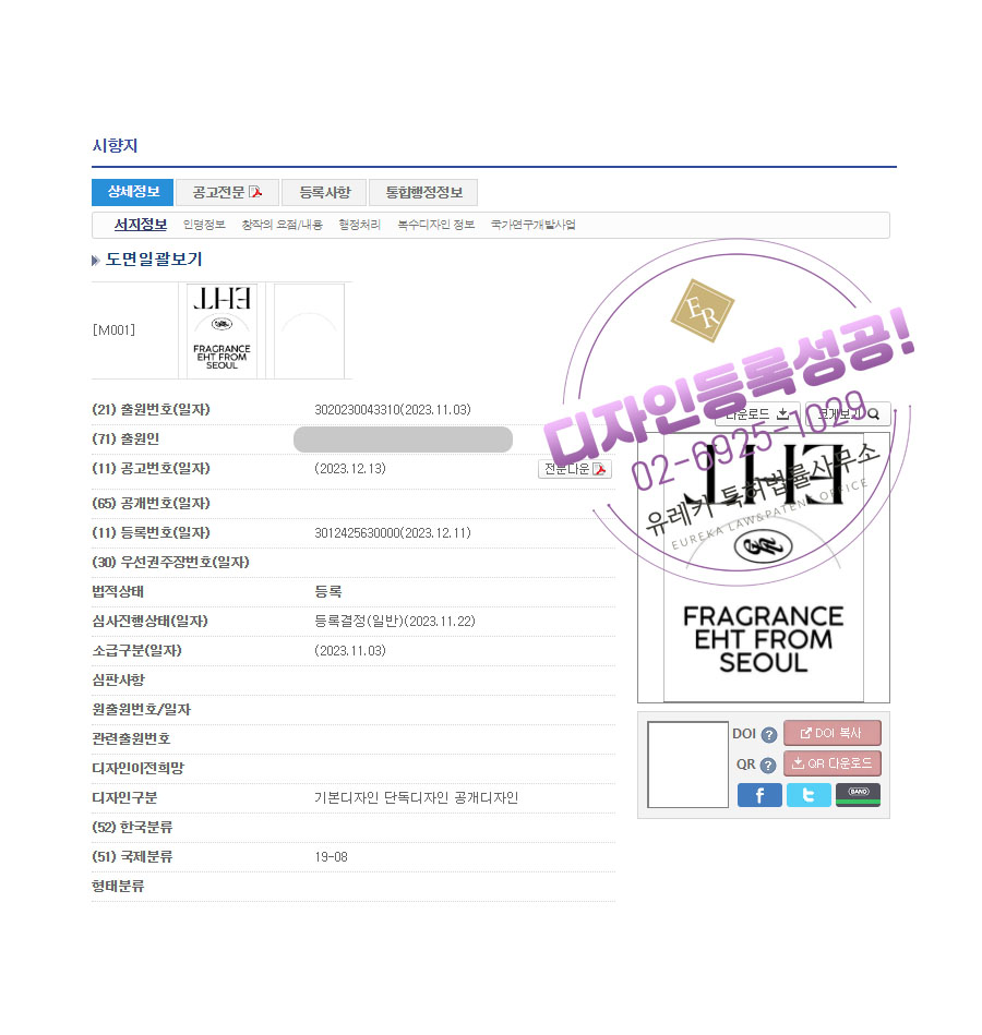 유레카특허법률사무소를 통해 디자인등록이 완료되었습니다.