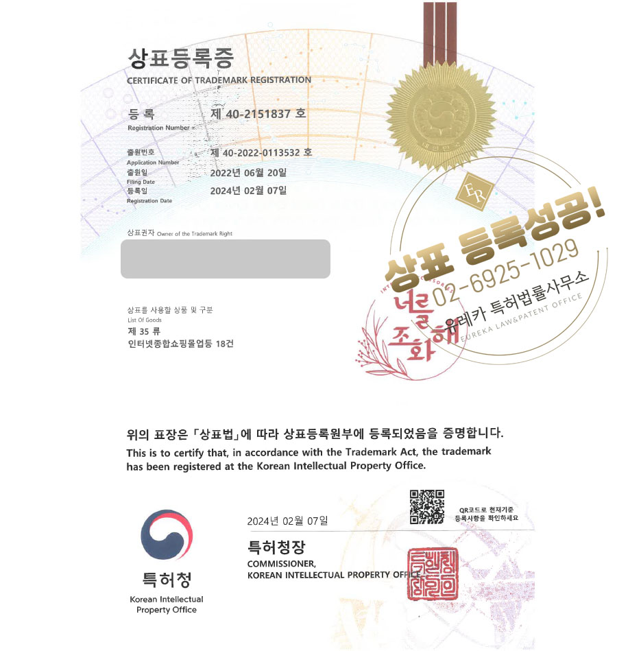 유레카 특허법률사무소에서 상표등록을 완료했습니다.