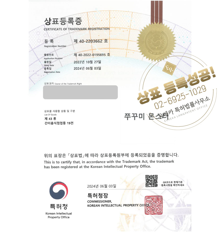 상표심사를 통과하여, 최종적으로 43 상표등록에 성공하였습니다!