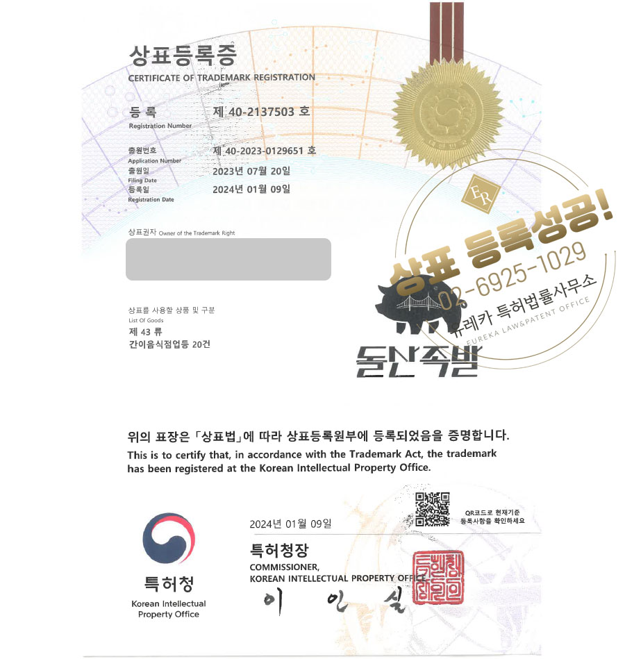 상표심사를 통과하여, 최종적으로 43류 상표등록에 성공하였습니다!