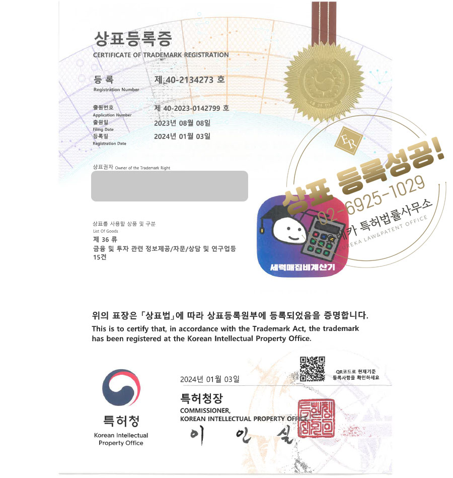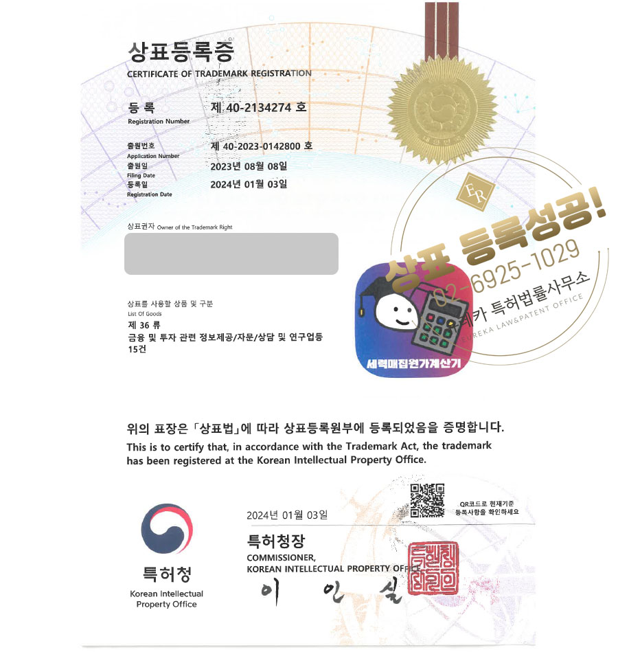 상표심사를 통과하여, 최종적으로 36류 상표등록에 성공하였습니다!