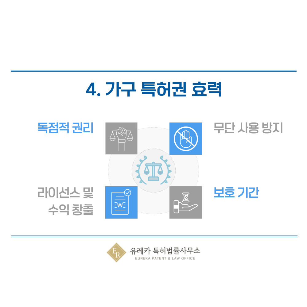 등록된 특허는 일정 기간 동안 독점적 권리를 보장받아 가구 시장에서 경쟁 우위를 확보할 수 있습니다.