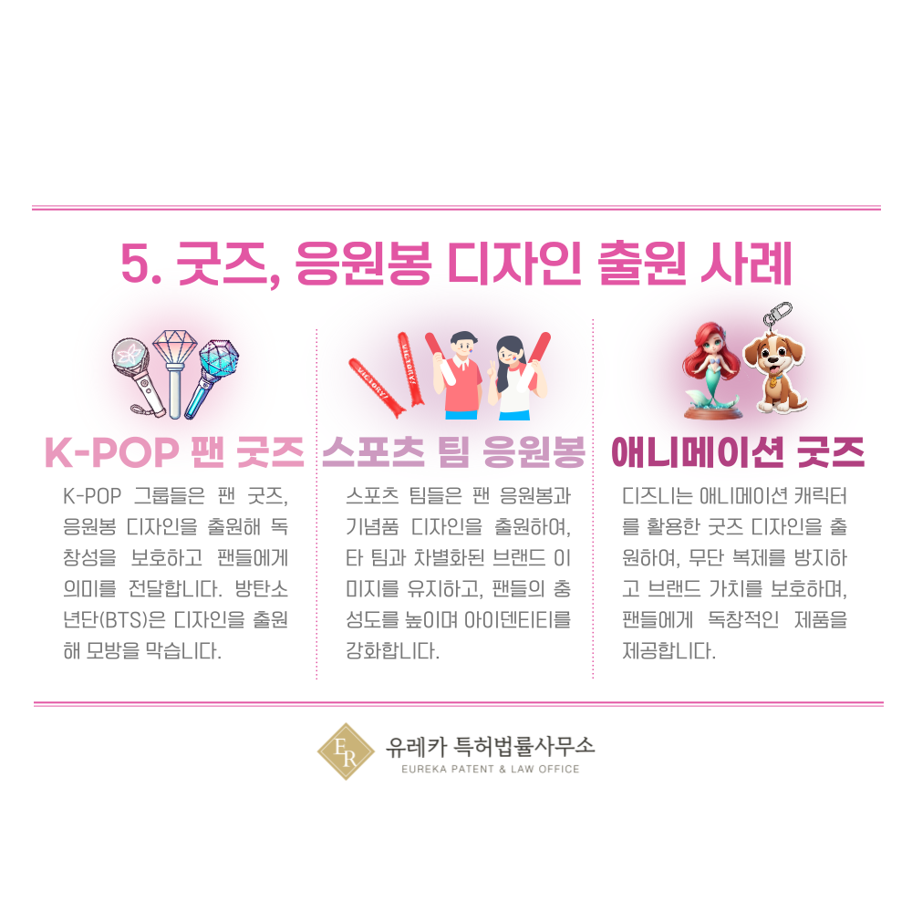 이렇게 디자인권을 통해 굿즈의 독창성을 유지하고, 팬들에게 특별한 의미를 부여할 수 있습니다.