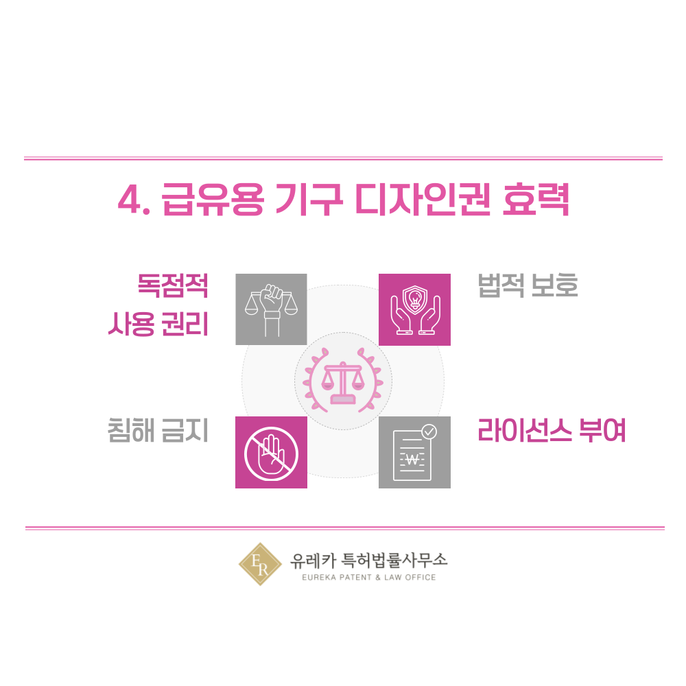 디자인권은 단순한 명칭이 아니라 법적으로 강력한 보호를 받는 권리입니다. 타인이 무단으로 모방하거나 유사한 디자인을 적용한 제품을 출시할 경우, 권리자는 이를 제재할 수 있는 근거를 가집니다. 경고장 발송, 가처분 신청, 손해배상 청구 등 다양한 법적 절차를 통해 자신의 권리를 적극적으로 지킬 수 있습니다.