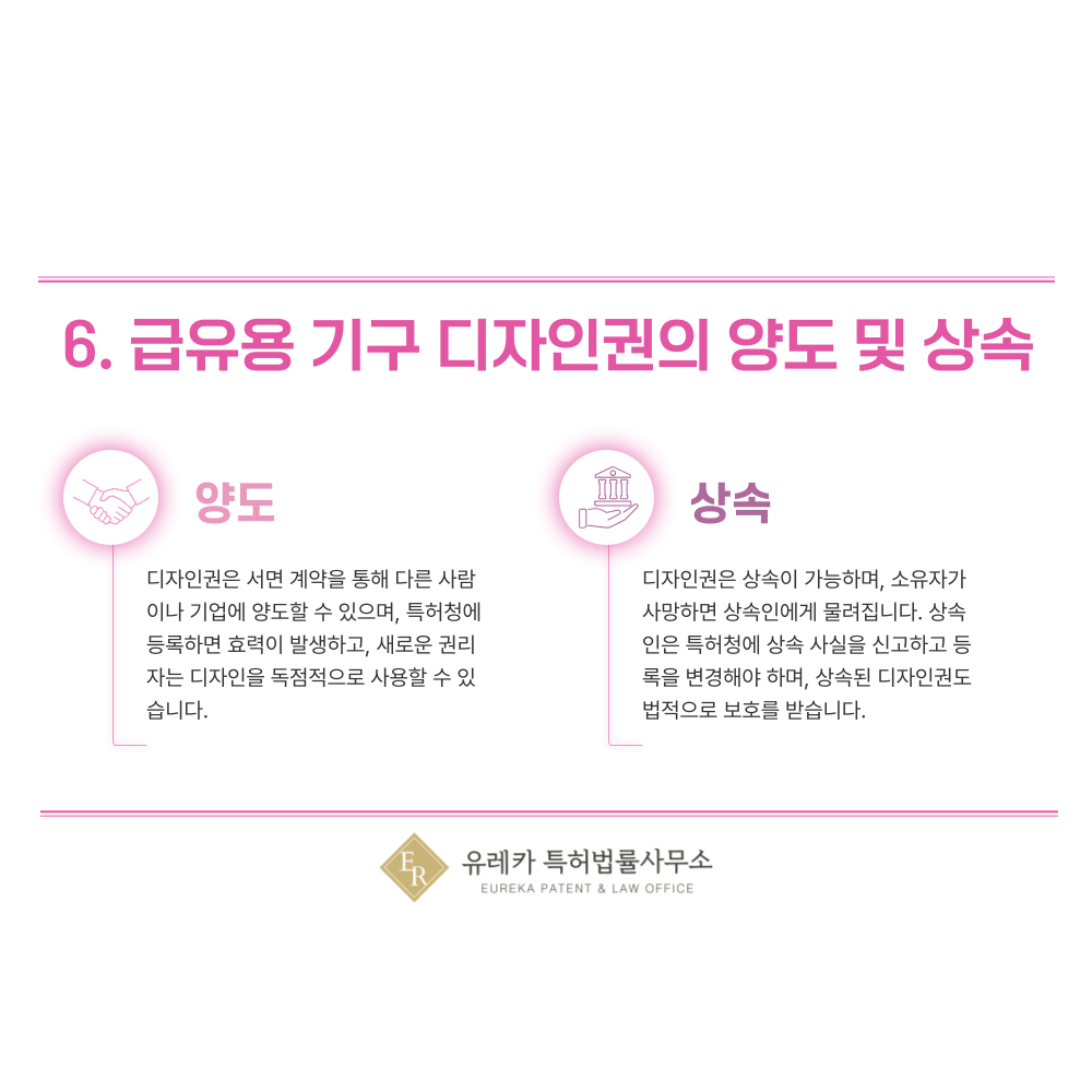 디자인권은 재산적 가치가 있는 권리이므로 권리자가 사망하면 상속 재산에 포함되어 상속인에게 승계됩니다. 상속인은 권리자의 지위를 이어받아 급유용 기구 디자인을 독점적으로 사용할 수 있고, 침해가 발생했을 때도 법적으로 대응할 수 있습니다. 다만 상속 사실만으로는 제3자에게 효력이 완전히 인정되지 않으며, 특허청에 상속 등록을 해야 권리가 공식적으로 보호됩니다. 따라서 상속인이 권리를 안정적으로 행사하기 위해서는 신속히 등록 절차를 마치는 것이 필요합니다.