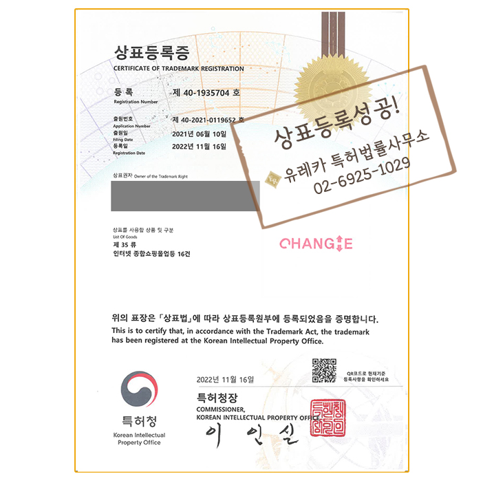 남성의류 상표등록 셔츠도소매 가방도소매 CHANGE 로고 상표등록 성공!