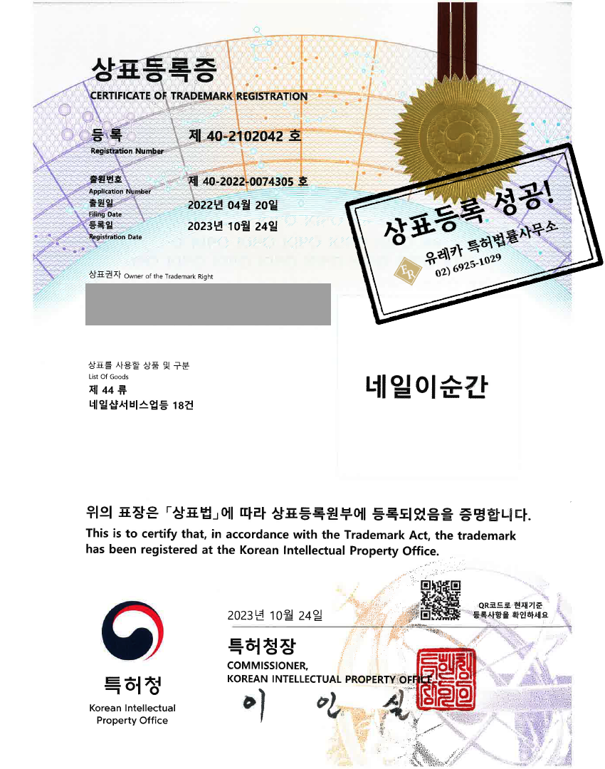 네일샵, 미용실, 피부관리, 제모, 왁싱, 속눈썹, 문신 '네일이순간' 상표등록 완료 / 유레카 특허법률사무소
