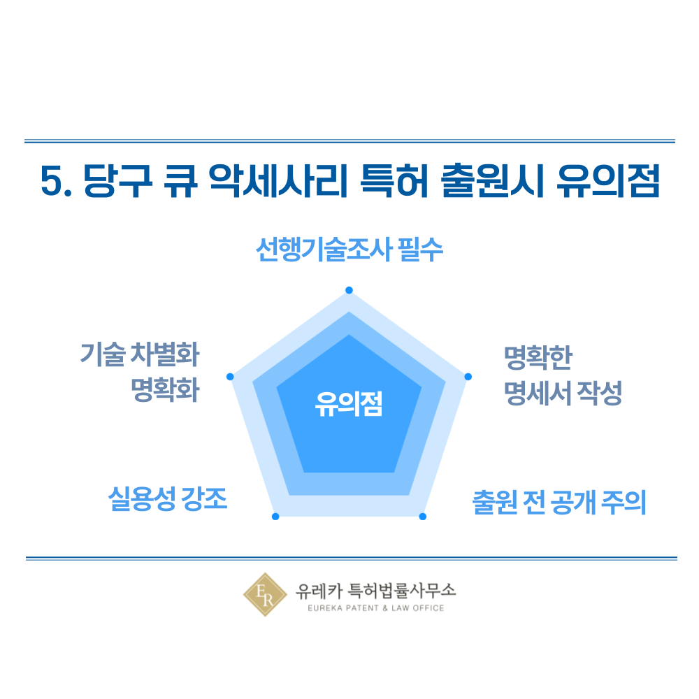 큐의 구조, 분리 방식, 진동 억제 기술, 그립 설계 등 핵심 내용을 구체적으로 설명한 명세서와 보호받고 싶은 범위를 정한 청구항을 준비해요.