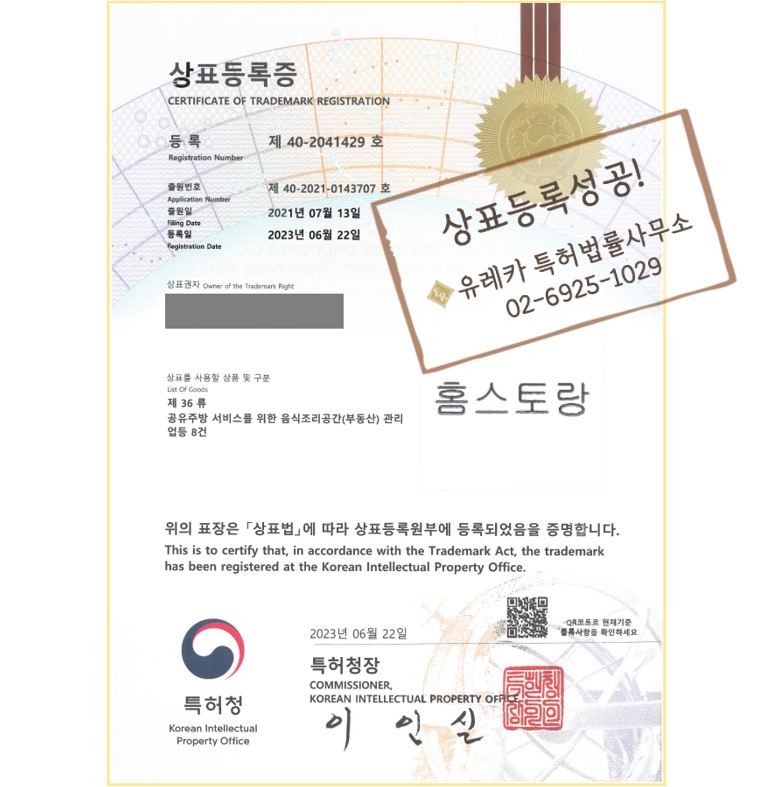 대여, 부동산, 음식조리, 공유주방 (배달형, 제조형, 커뮤니트형) "홈스토랑" 유레카에서 상표등록 완료!