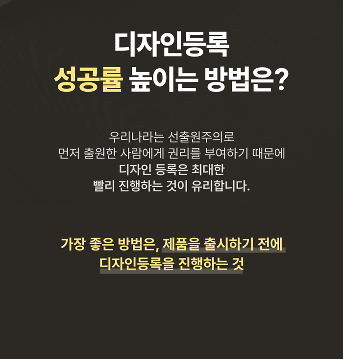 또한 등록 요건 중 하나인 '신규성'이 인정되어야만 등록이 가능하기 때문에 제일 좋은 방법은 제품 출시 전 미리 디자인등록을 진행하는 것입니다!