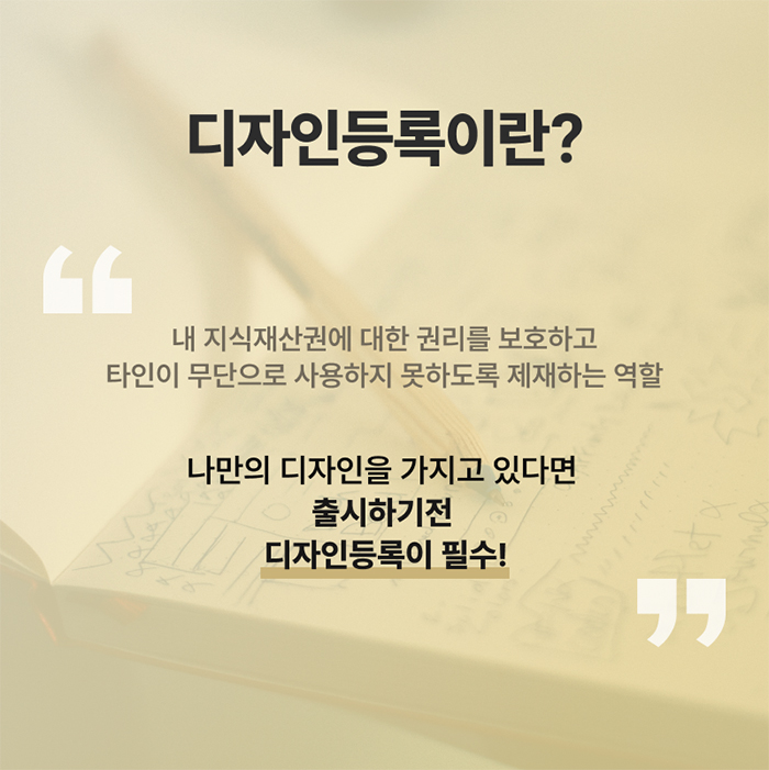 디자인등록은 내 디자인에 대한 권리를 보호하고, 타인이 무단으로 사용하거나 모방하지 못하도록 제재하는 역할을 하고 있습니다.