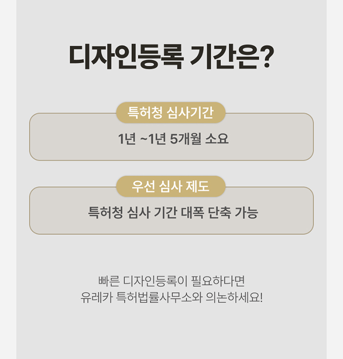 또한 우선 심사 제도를 이용할 경우, 1년 이상 걸리는 특허청 심사 기간을 획기적으로 줄일 수 있기 때문에 빠른 디자인 등록이 필요하시다면 유레카와 의논해보셔도 좋겠습니다.