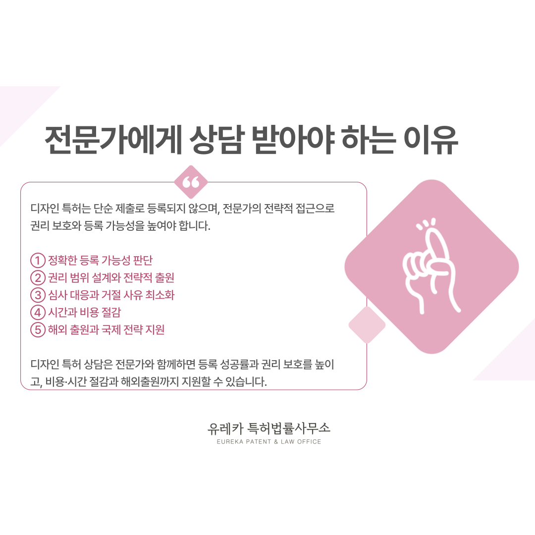 결국, 디자인 특허 상담은 등록 성공률 향상, 권리 보호 강화, 비용 절감, 해외출원 지원까지 연결되는 필수 과정입니다.
