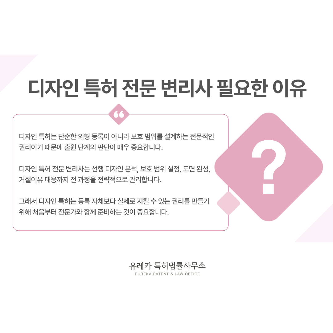 디자인 특허 전문 변리사가 필요한 이유는 디자인 특허의 성격 자체가 단순한 서류 절차가 아니기 때문입니다.