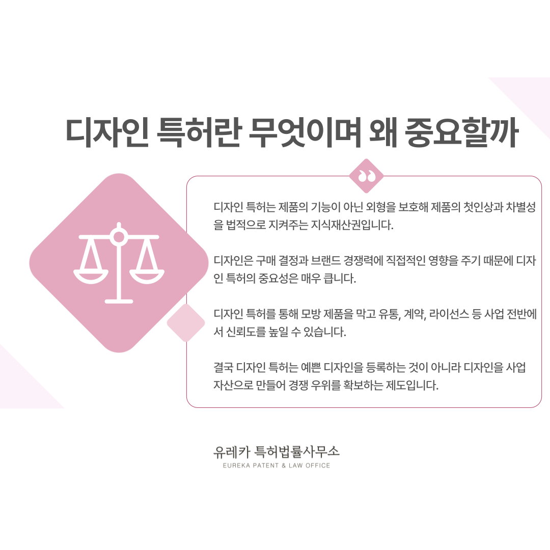이 때문에 디자인 특허는 브랜드 경쟁력과 직결되는 권리로 평가됩니다.