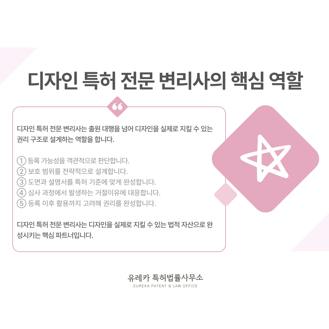 디자인을 법적으로 보호 가능한 권리 구조로 설계하는 것이 핵심 역할입니다.