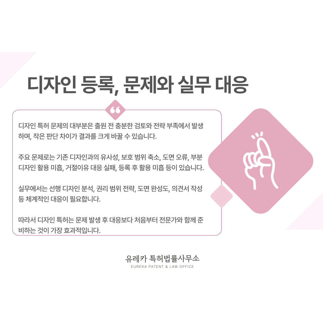 아래는 디자인 특허 과정에서 실제로 가장 많이 발생하는 문제와 그에 대한 실무 대응 방향입니다.