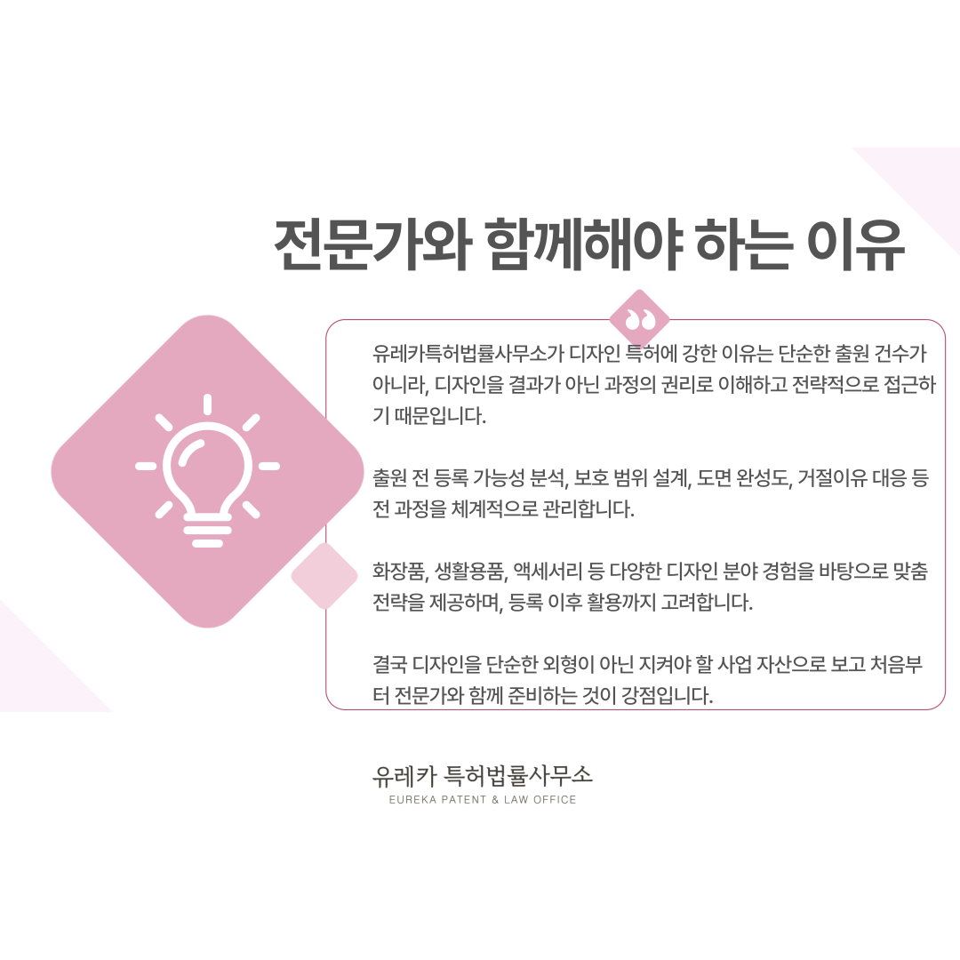 이 균형 잡힌 대응은 디자인 특허 전문 변리사의 실무 경험에서 나옵니다.