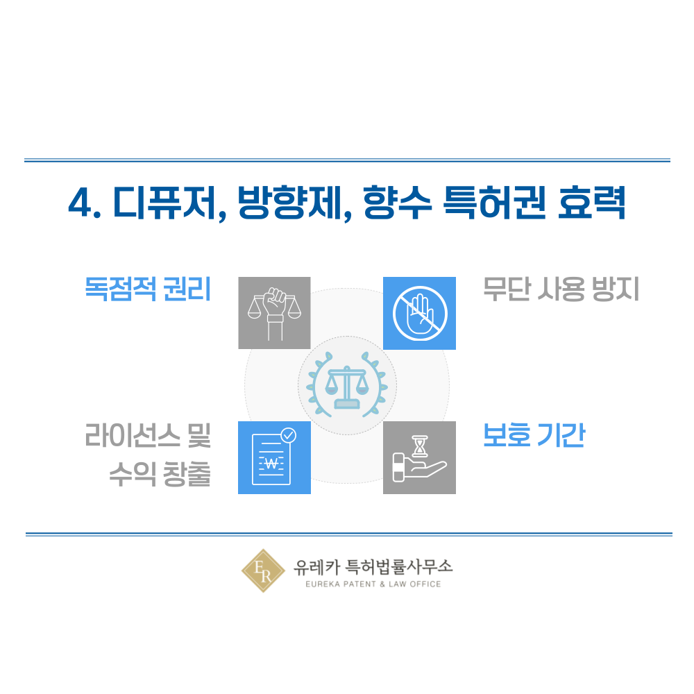 특허권자는 등록된 향 조성이나 발향 구조를 자신만 사용할 수 있는 독점적인 권리를 가집니다.