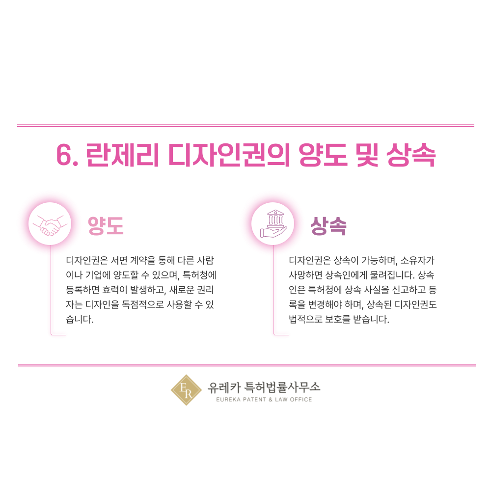 디자인권은 재산권의 성격을 가지기 때문에 권리자가 사망하면 상속의 대상이 됩니다. 상속인이 권리를 승계하면, 해당 란제리 디자인을 법적으로 보호받으며 자유롭게 활용할 수 있습니다. 상속이 이루어진 경우에도 특허청에 이를 신고·등록해야 권리가 확정적으로 인정되며, 이를 통해 권리의 단절 없이 안정적으로 유지될 수 있습니다.