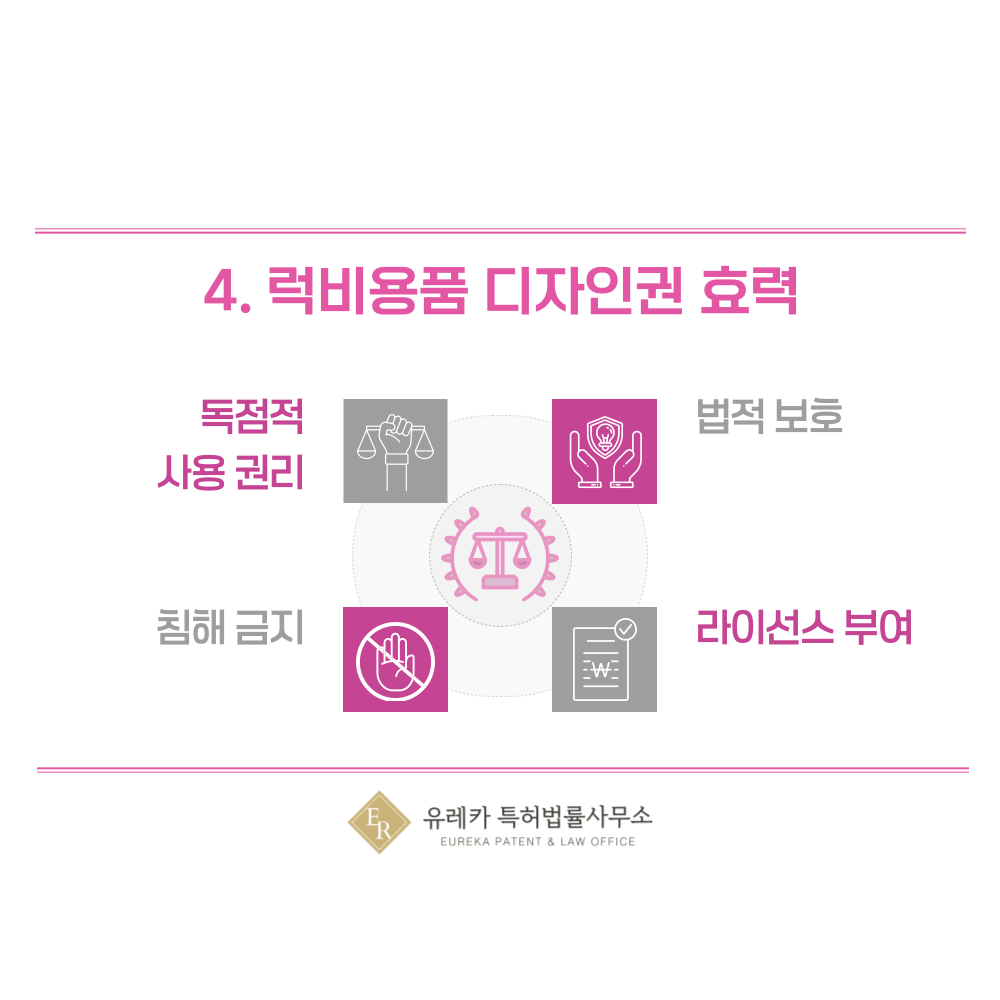 즉, 디자인권은 타인이 권리를 침해하지 못하도록 막는 실질적 제재력을 갖춘 권리입니다.