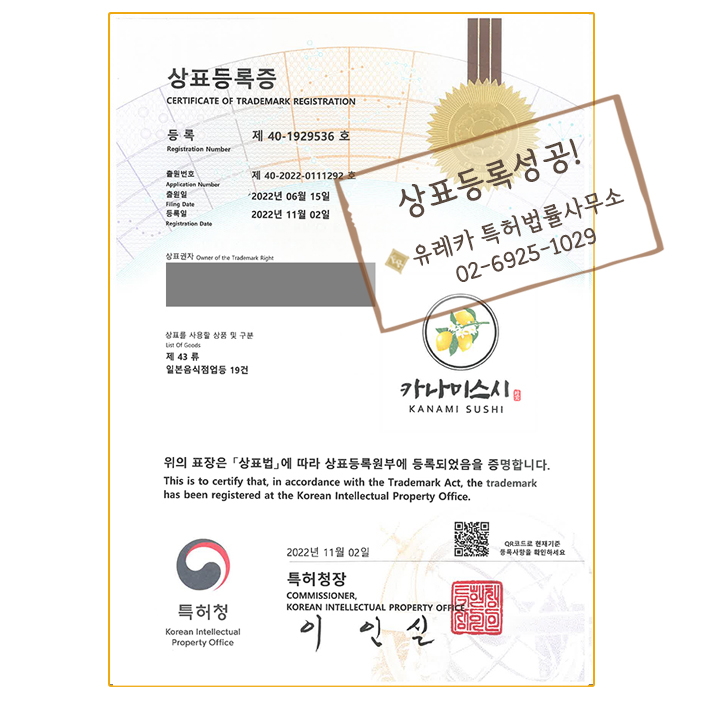 일본음식점 상표등록성공! 주점 식당서비스 스시 초밥 '카나미스시'