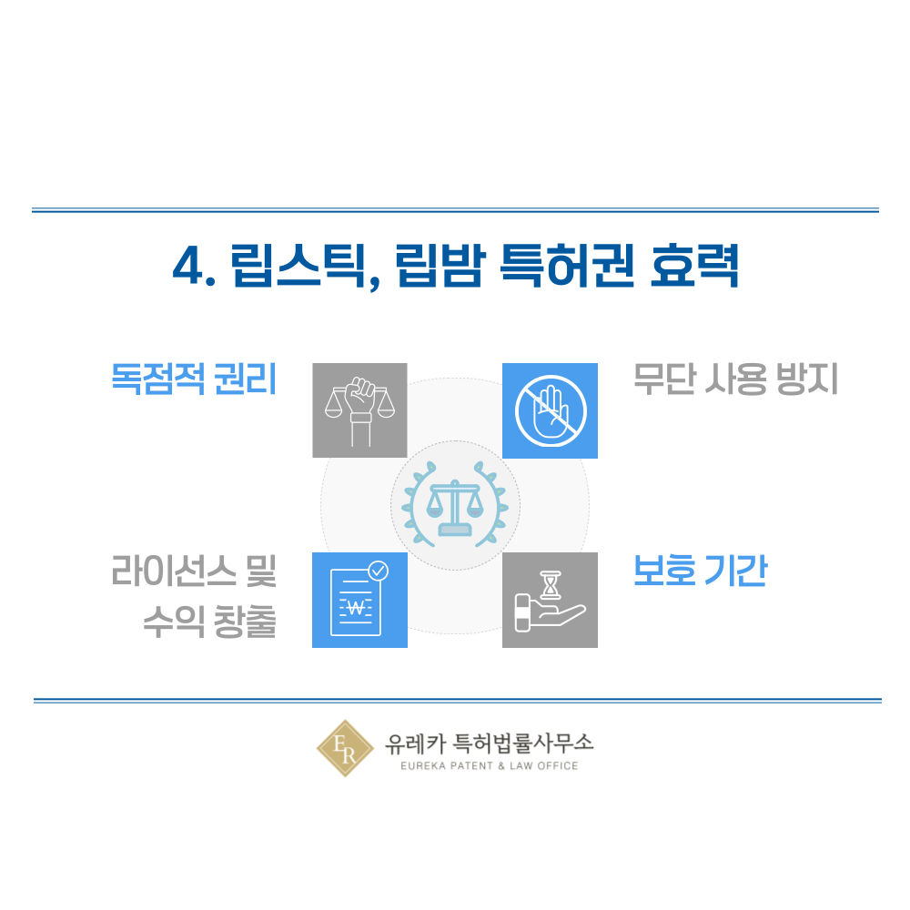 특허권자는 해당 립스틱·립밤 용기 기술을 직접 사용하고 제품에 적용할 수 있는 독점적인 권리를 가지게 돼요. 등록된 기술은 특허권자만이 자유롭게 제조, 판매, 활용할 수 있어요.