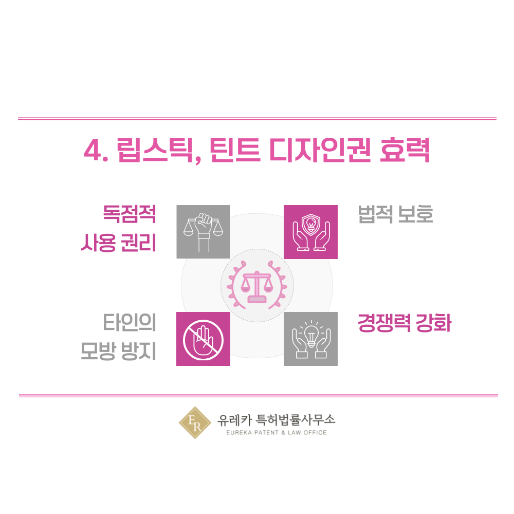 디자인권을 통해 타인이 동일한 디자인을 사용하거나 모방할 수 없게 됩니다.