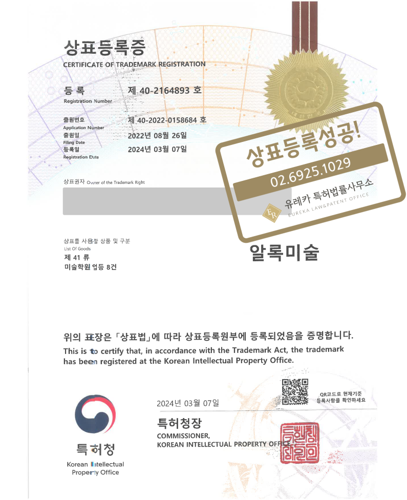 위 사례는 미술, 취미교육, 학원 분야인41류 상표등록 건입니다.