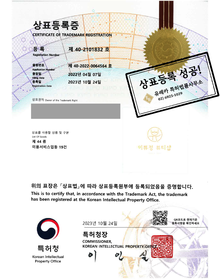 미용실, 타투샵 '이쀼정 뷰티샵' 로고 상표등록 완료 - 유레카 특허법률사무소에서
