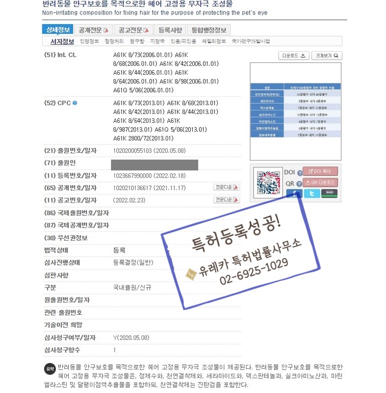 반려동물용품, 반려동물 안구보호, 기능성보호대 "반려동물 안구보호를 목적으로한 헤어 고정용 무자극 조성물" 유레카에서 특허등록 완료!