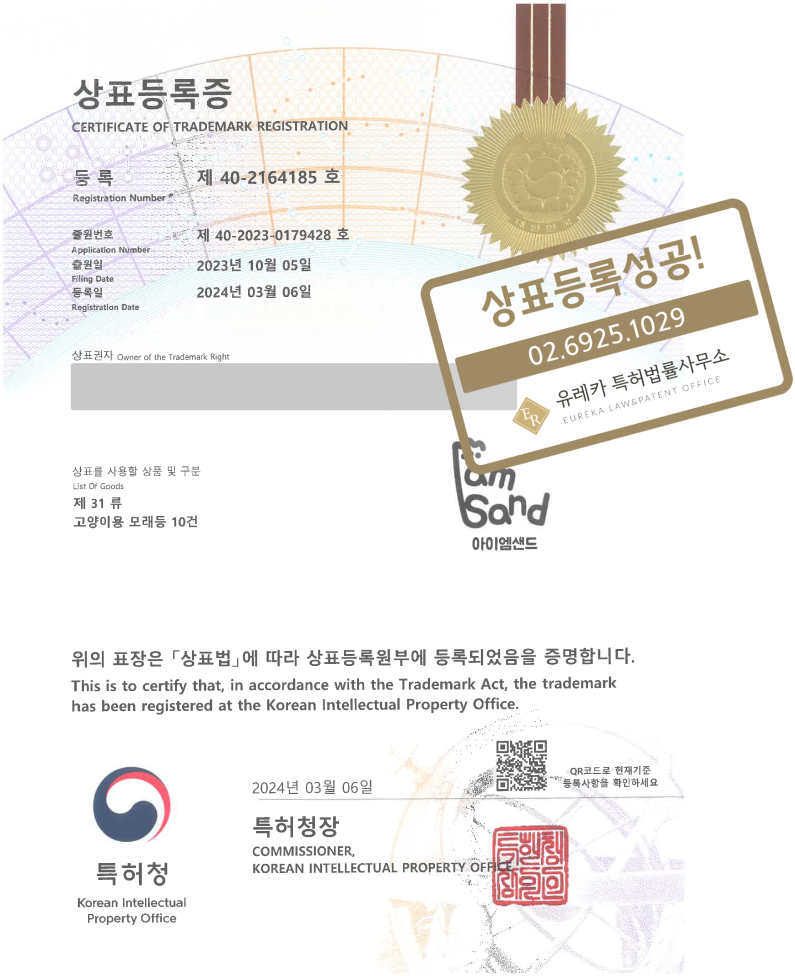 반려동물용품, 애완동물용품, 동물용 모래, 고양이 모래 '(logo) 아이엠샌드' 유레카에서 상표등록 성공!