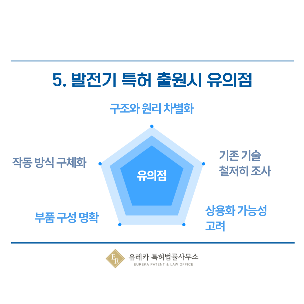 발전기는 기존에 많이 연구된 분야라서, 단순한 형태 변경만으로는 특허를 받기 어려워요. 발전 방식, 에너지 변환 원리, 내부 구조 등에서 뚜렷한 차별성이 있어야 해요.