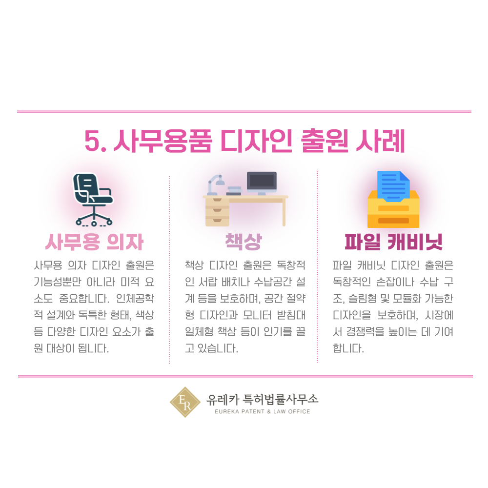 예를 들어, 책상의 서랍 배치나 다리 디자인을 독특하게 변형하거나, 수납공간을 효율적으로 설계한 경우 디자인 출원을 통해 보호받을 수 있습니다.